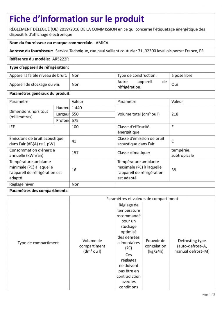 | Type réfrigérateur | Réfrigérateur 1 porte |