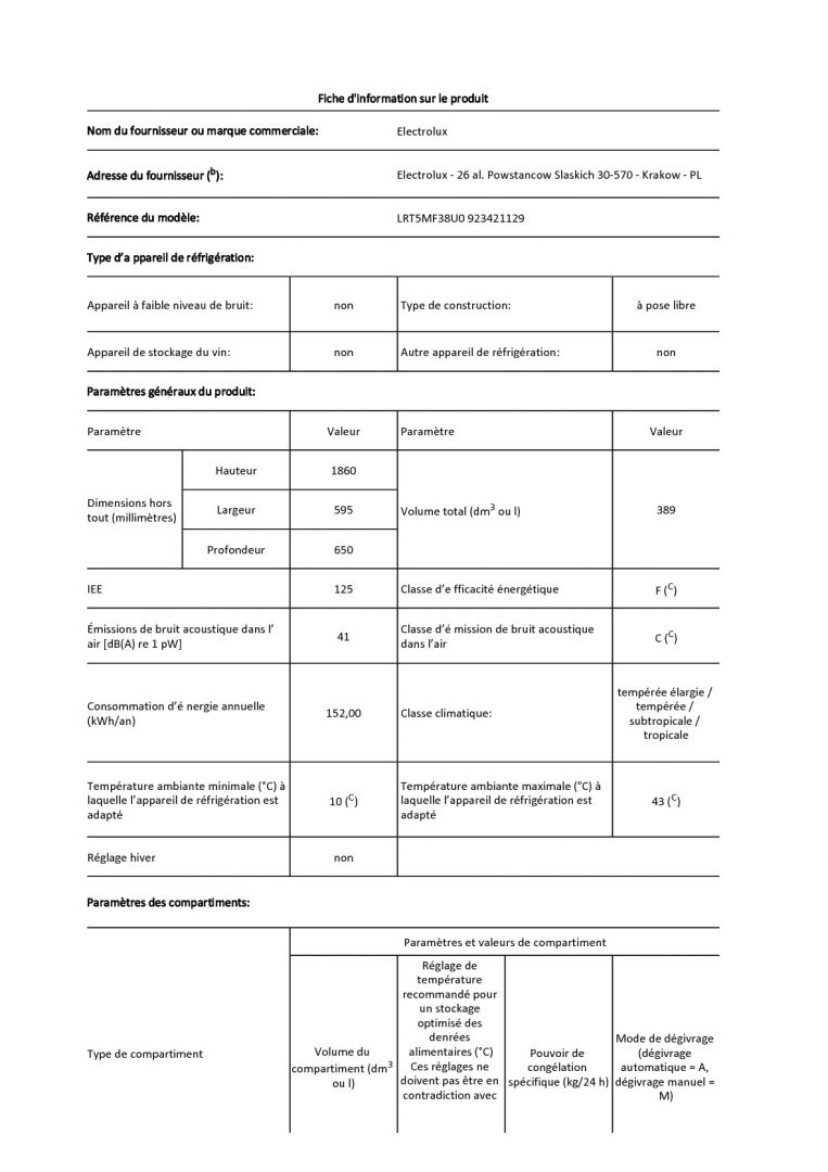 | Volume réfrigérateur (L) | 389.5 |