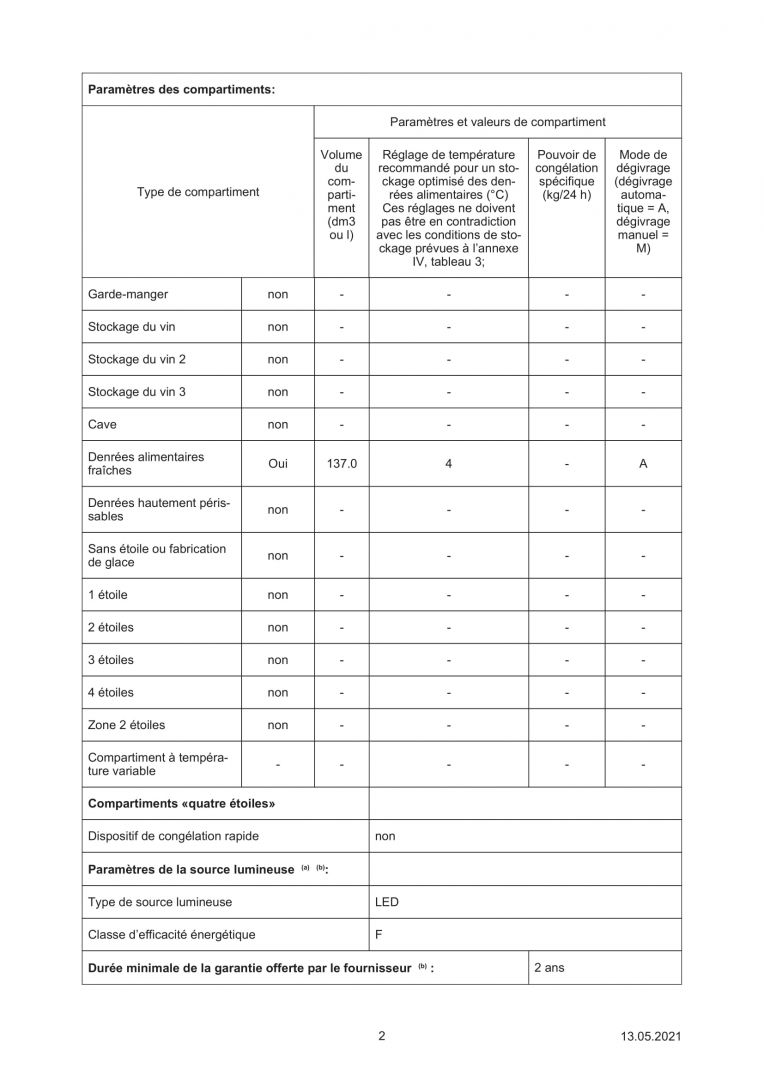 | Nbre de clayettes réglables | 2 |