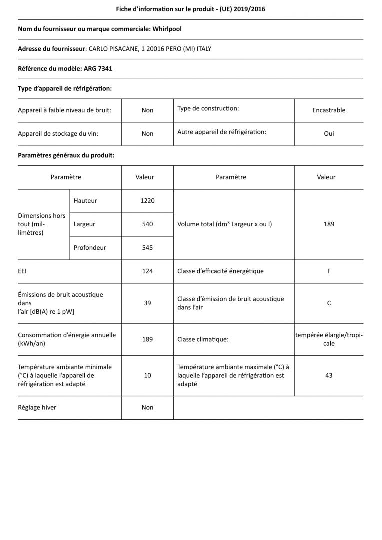 | Conso. d’énergie annuelle (kWh/an) | 189 |